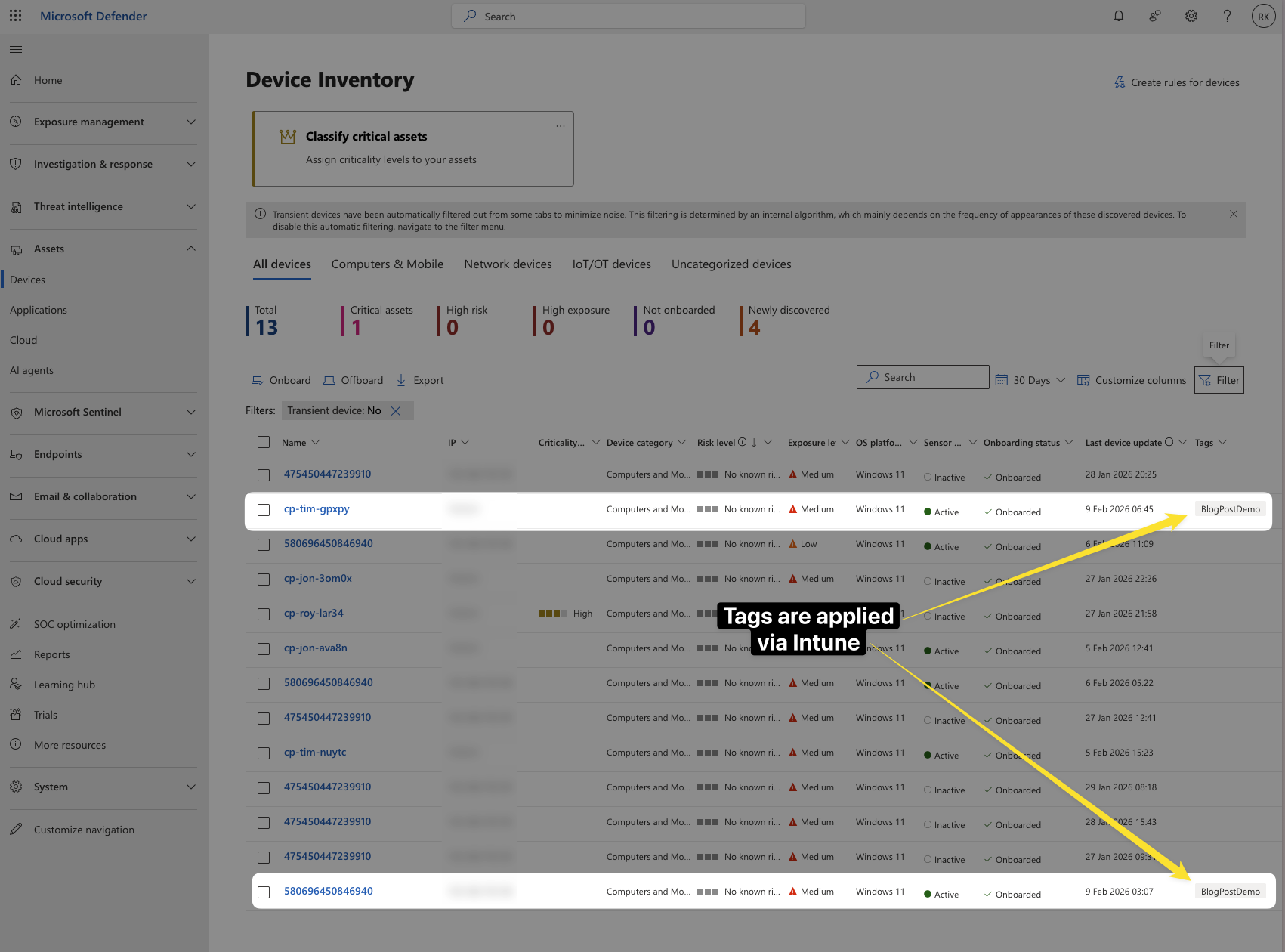 Because the tag is device-driven when deployed from Intune, changes belong in Intune; editing the tag only in the Defender portal won’t persist. For automatic tagging based on device attributes (name, domain, OS), you can complement this with dynamic rules for device tagging in Microsoft Defender XDR asset rule management.