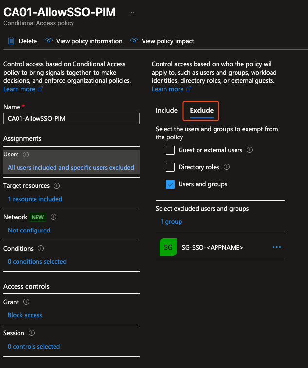 A key part of securing this workflow is creating a Conditional Access policy that enforces a strict “PIM-only” path for your sensitive application. This policy will act as a gatekeeper, blocking all access to the application by default, with one critical exception: it will exclude a security group that is managed by PIM. This setup ensures that the only way to gain access is to activate via PIM.